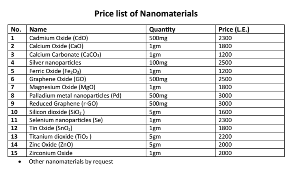 قائمة باسعار المواد النانومترية المتاحة بالمعمل